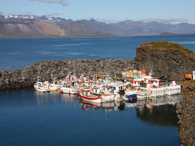 Formed of successive lava flows from Snaefellsjokull eruptions, its basalt cliffs are constantly pounded by huge waves. The only road through the village ends at the harbor, where a couple of small fishing vessels defy the waves and land a worthwhile catch.