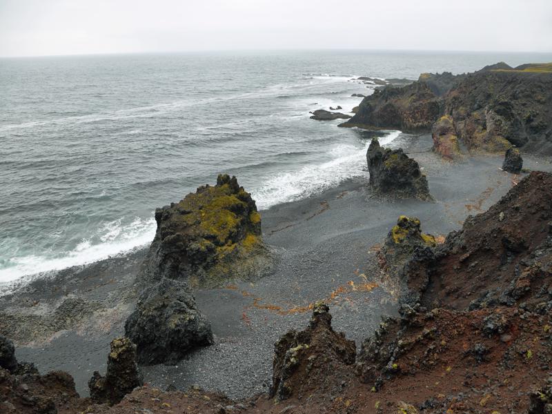 From the car park a trail leads down steps to the sea, a five-minute walk. At the edge of the beach see the boulders that fishermen had to lift to prove their strength. The smooth pebbles on this beach are said to be ‘lucky’ stones. The beach is littered with the remains of a shipwrecked British trawler. To your right, part way down the beach, a trail climbs onto the lava and takes you to the next bay, Dritvik. This was once one of the busiest seasonal fishing stations in Iceland! There are a few turf remains dotted in the vicinity, but little else remains. Return by the same route. From the car park you can continue walking in an easterly direction along the coast on a marked trail.
