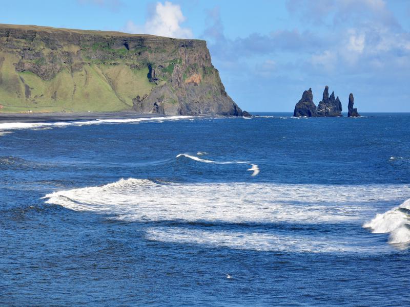 From the car park, bear west to follow the path along the coast and up to the lighthouse. There are good views of the natural rock arch and the black sand beaches stretching in both directions. Return by the same route and when you arrive back in the car park, spend some time exploring the interesting rock features close by, as well as the puffins nesting on the cliff north of the car park. Please note: it can be very dangerous to hike at Dyrholaey when it is windy or foggy - whatever the weather stay well back from the cliff edge.