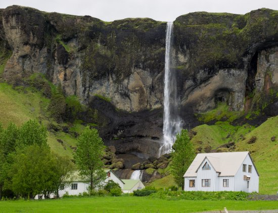 The farm Foss á Sidu is backed by cliffs, over which tumbles a rather lovely waterfall, known modestly as 'Foss', which most visitors know means waterfall.