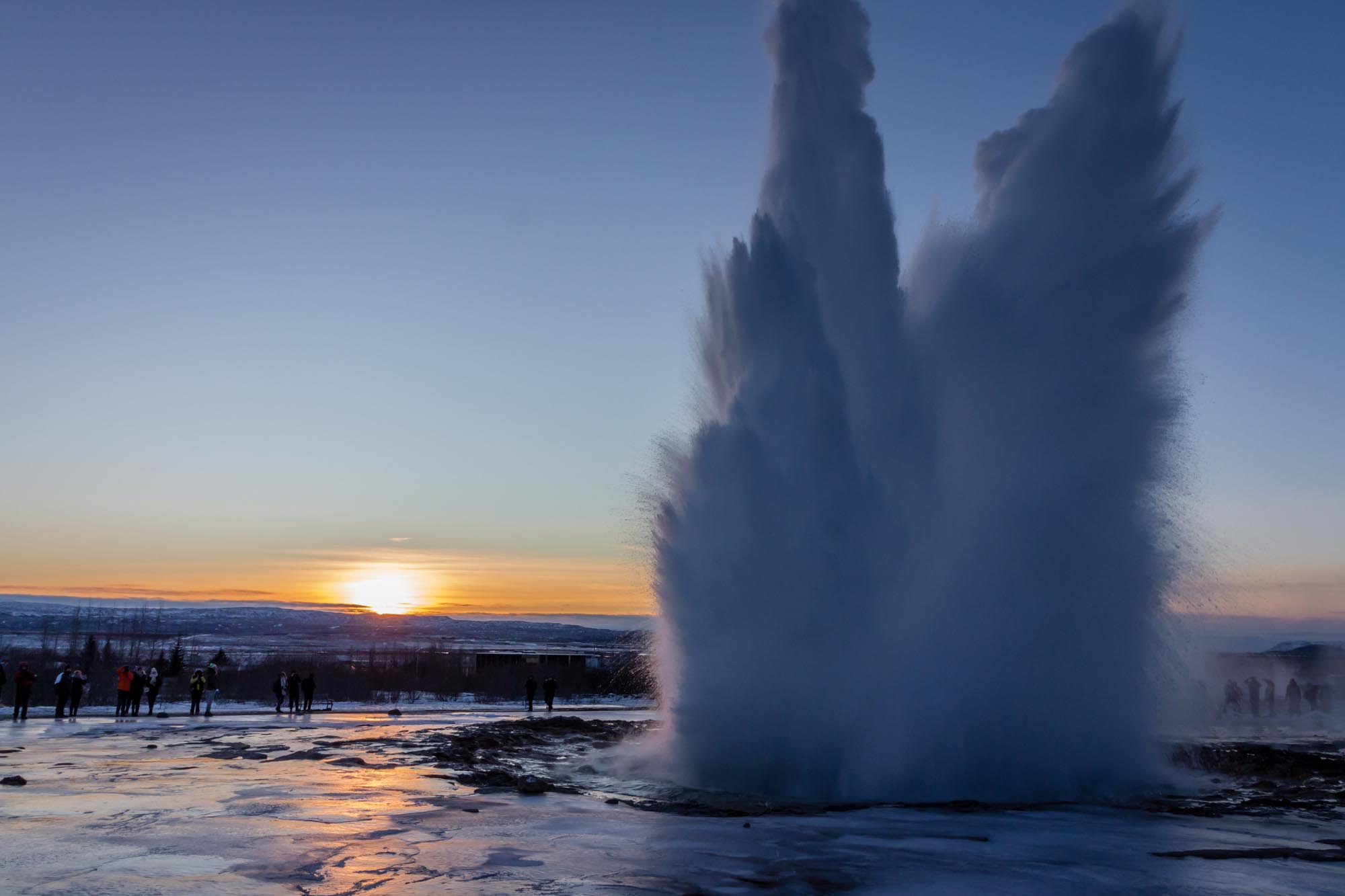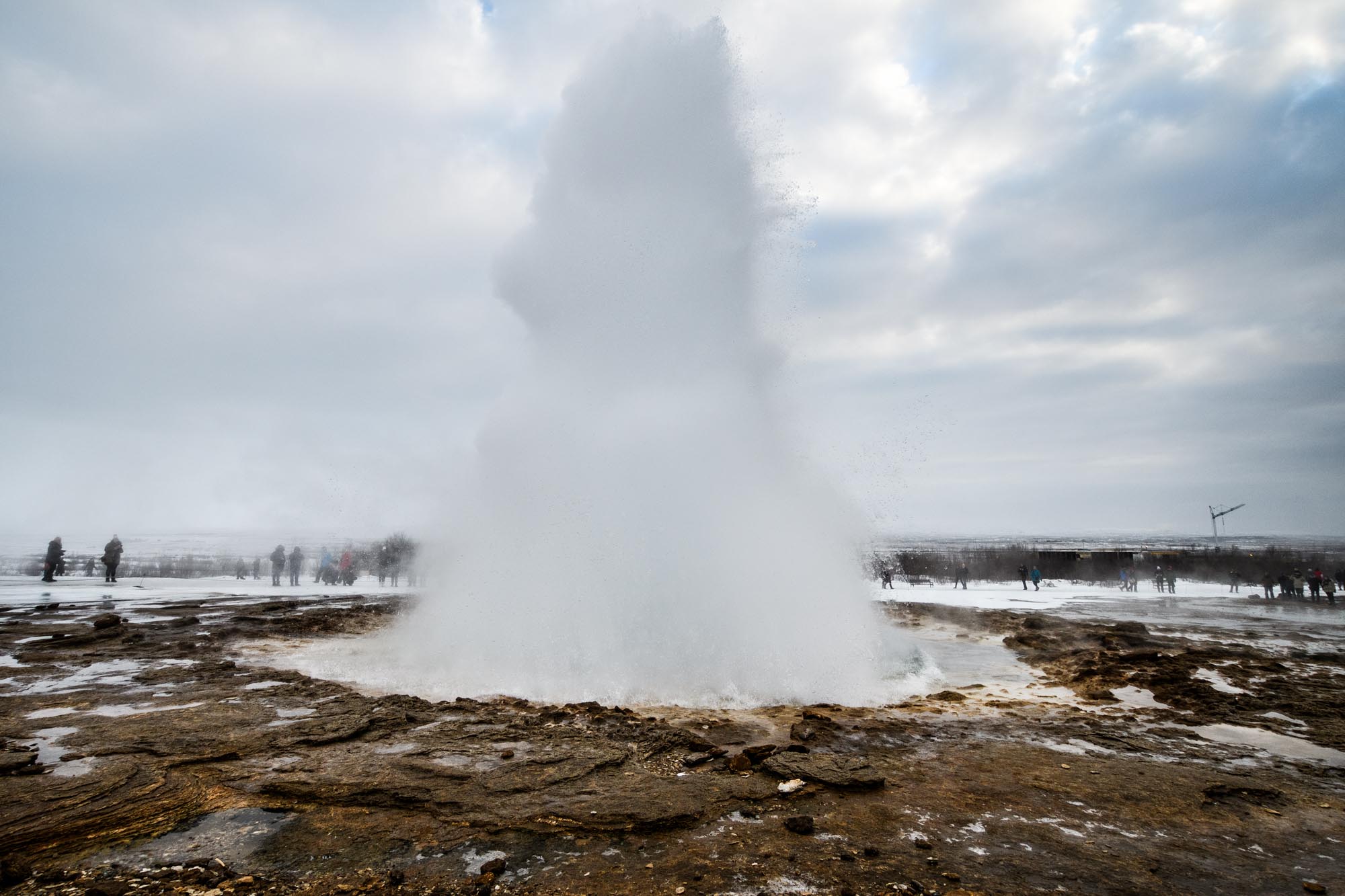 You can walk to the top of the hill behind Geysir for a wider view of the site. Unless you want a hot shower, stand upwind of the geyser and for your own safety don’t cross the rope barriers and please don’t throw coins or anything else into the hot springs.