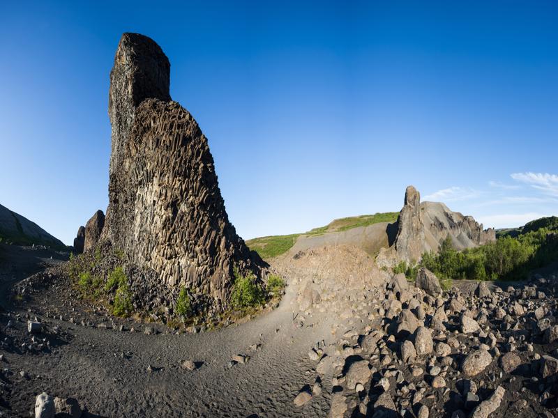 Useful Information: pick up a map at the warden’s office in Asbyrgi or Vesturdalur. Bring food and drink with you. Duration: 2-2.5 hours. Difficulty: fairly challenging circular walk on an uneven, rocky path. Interest: fantastic rock formations of columnar basalt, volcanic plugs, a crater. Start/End: from the Dettifoss to Asbyrgi road on the west bank of the river take the turning down a dirt track to Vesturdalur. As the hut comes into view bear left and continue to the car park (toilet) at the end of the track.