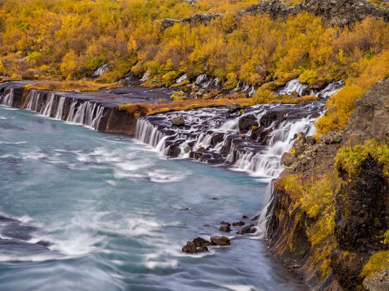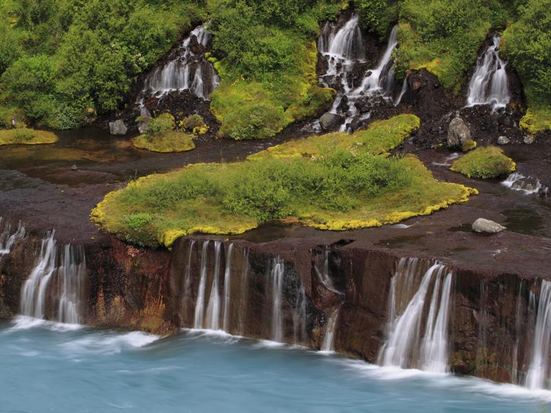 Possibly Iceland’s most unusual and enchanting waterfall, Hraunfossar ‘Lava Falls’ emerges from under a lava flow, cascading into the turquoise river Hvita.