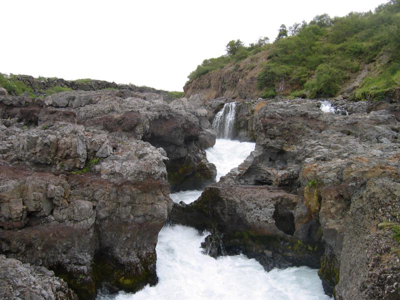 From the car park (toilets and cafe on site) follow the trail a little further up the river to Barnafossar waterfall, where the river roars through a narrow chasm.
