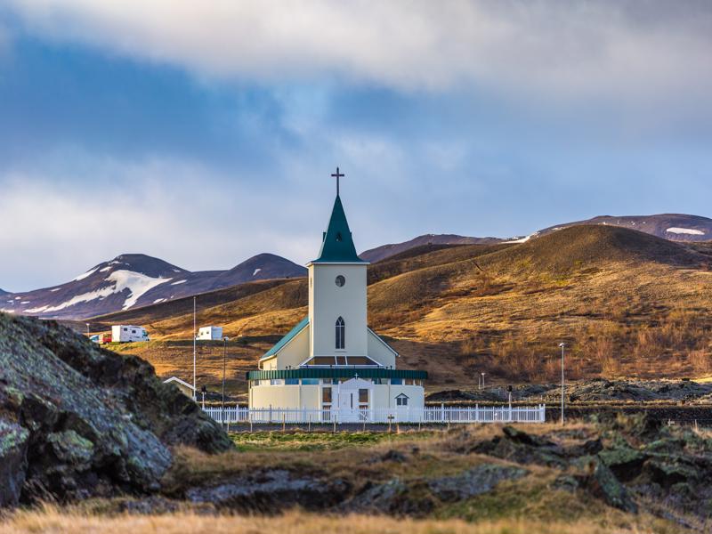 At Reykjahlid, there are two hotels, a Visitor Centre, cafe, supermarket, and craft shops. During the 1724-9 eruptions, lava almost engulfed the church standing on the same site as the present modern one. Numerous walking trails start from the village – pick up a map at the Visitor Centre.