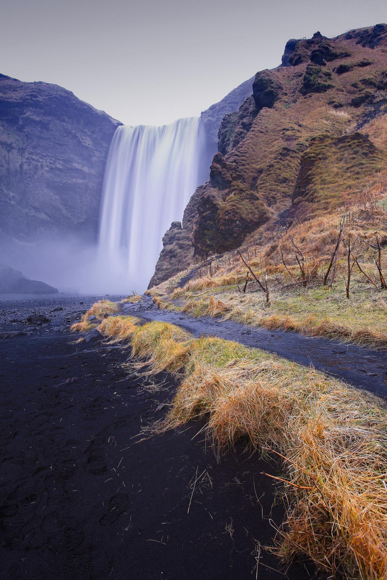 The river Skoga is not glacially fed and usually runs clear but following the 2010 eruption of Eyjafjallajokull, ash washed down in the river sometimes makes the water look grey.