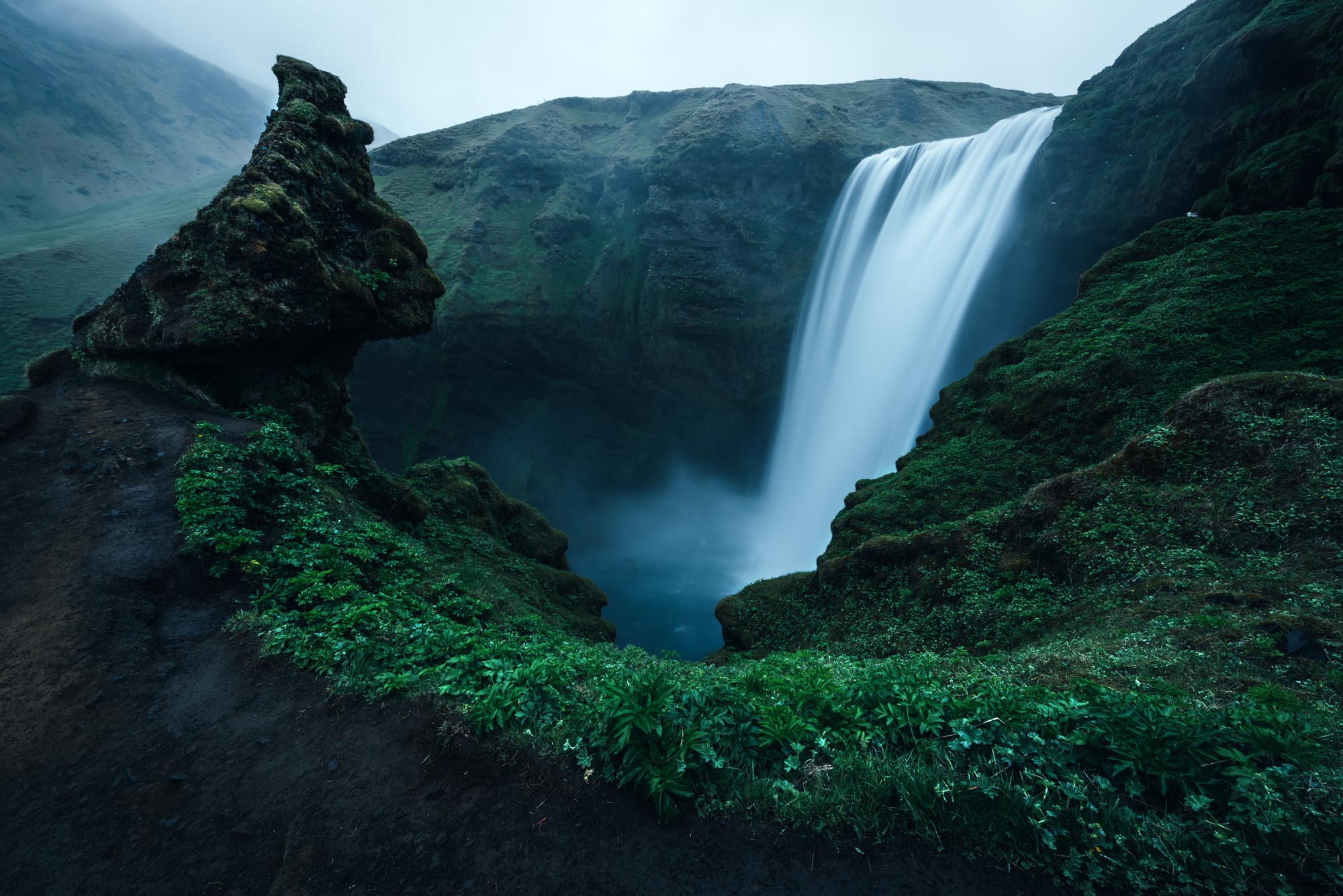 The soft palagonite rock surrounding the waterfall has been eroded into intricate cliff formations while the grassy slopes are extraordinarily green in summer.
