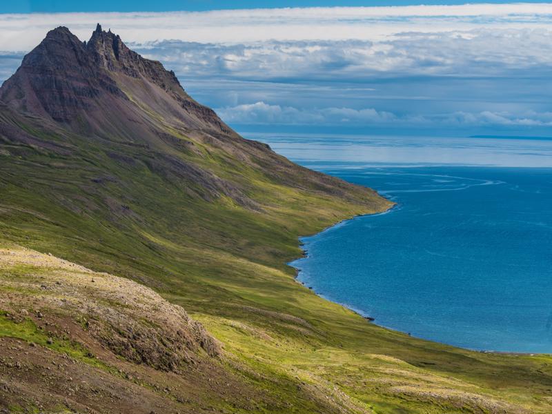 The road snakes along the coast between steep rocky summits and the pounding sea. At Djupavik you can visit the old herring station and have coffee at the guesthouse.