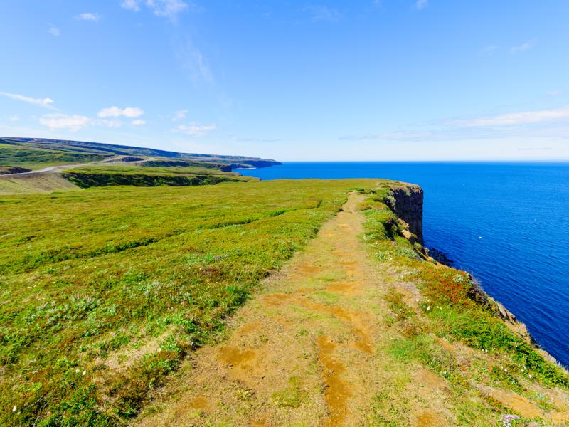 On the east side of the Tjornes peninsula, puffins can be observed from a cliff top viewpoint overlooking Oxarfjordur Bay.