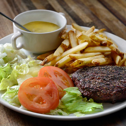 Beefsteak 200 gr. With deep-fried potatoes, béarnaise- or pepper sauce, fresh salad, and a large beer. Kr. 3.400,-
